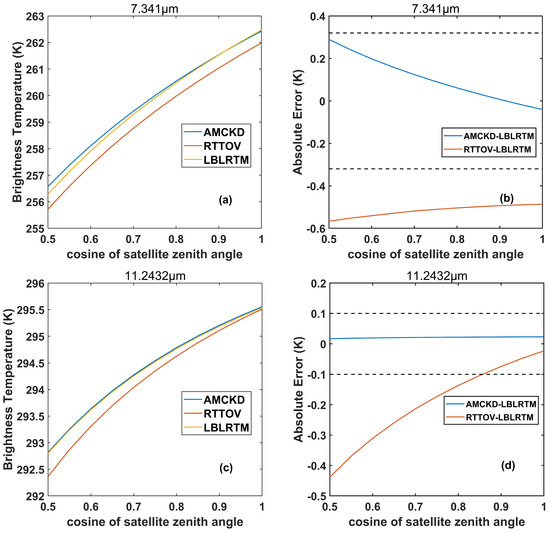 The brightness temperatures at different viewing zenith angles simulated by LBLRTM, AMCKD, and RTTOV are shown in Figure 3. We consider the 7.3471 μm and 11.2432 μm channels of AHI because the first one is an important water vapor band and the latter is located in the atmospheric window region. Both channels show relatively accurate results for RTTOV in Table 1. For the 7.3471 μm channel, the absolute errors of AMCKD against LBLRTM are bounded by 0.35 K. The error decreases with the increase of cosine of viewing zenith angles. RTTOV is obviously inferior to AMCKD, with errors larger than 0.4 K at all viewing zenith angles. For the 11.2432 μm channel, the maximum absolute error AMCKD is less than 0.03 K, while the errors of RTTOV are more than doubled. Moreover, all errors of AMCKD are located within NEDT, but the errors of RTTOV are beyond the ranges of NEDT. The results of Table 1 and Figure 3 indicate that AMCKD is superior to RTTOV under the standard atmosphere conditions.