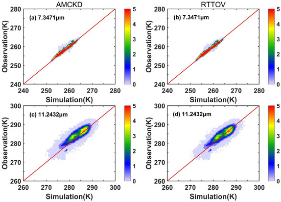 The joint probability distribution function (PDF) (‰) of simulated brightness temperature by AMCKD (a,c) and RTTOV (b,d) and observations of AHI for the 7.3471 μm (a,b) and 11.2432 μm (c,d) channels with a clear sky.