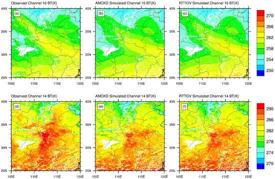 Comparison between simulated brightness temperature by AMCKD (b,e), RTTOV (c,f) and observations (a,c) of AHI 7.3471 μm (channel 10) (a–c) and 11.2432 μm (channel 14) (d–f) channels with a clear sky. The blank area is the cloudy area.