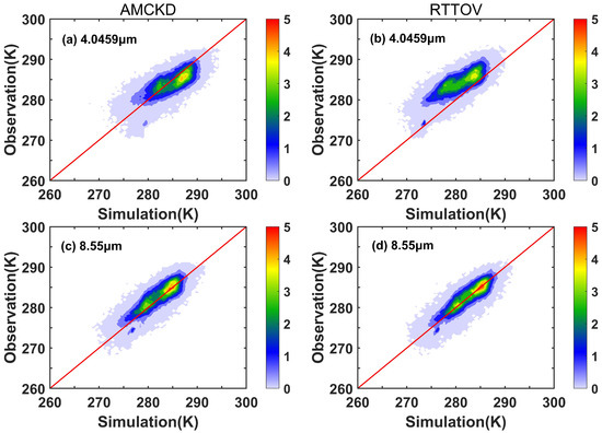 The joint probability distribution function (PDF) (‰) of simulated brightness temperature by AMCKD (a,c) and RTTOV (b,d) and observations of MERSI for the 4.0459 μm (a,b) and 10.7139 μm (c,d) channels with a clear sky.