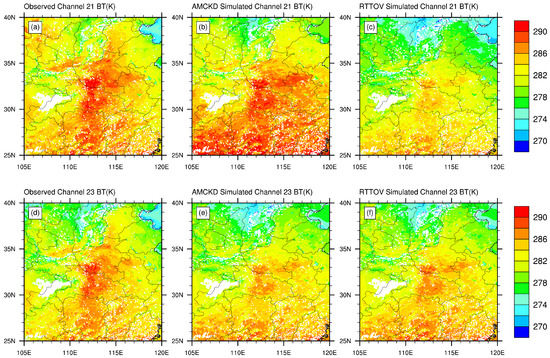 Comparison between simulated brightness temperature by AMCKD (b,e) and RTTOV (c,f) and observations (a,d) of MERSI 4.0459 μm (channel 21) (a–c) and 10.7139 μm (channel 23) (d–f) channels with a clear sky. The blank area is the cloudy area.