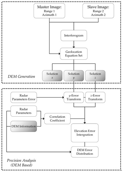 Using the DEM generation formula, the error transform coefficients from the InSAR parameters to the DEM coordinates are analyzed. Because of the high-steepness scene conditions, the y- and z-coordinates are both considered and integrated. The calculation method for the correlation coefficient is meticulously discussed on the basis of the existing DEM and radar configuration. Two direction errors are integrated into the elevation on the basis of the slope gradient. Finally, combining the error analysis equation with the pre-existing DEM information and radar parameters, a DEM error distribution is acquired. The result is adaptive to different viewing scenes and encompasses the performance for the whole area; it will also help with baseline optimization. Section 2 mainly discusses the DEM generation process, and Section 3 discusses precision analysis. The total flowchart has shown in Figure 1.
