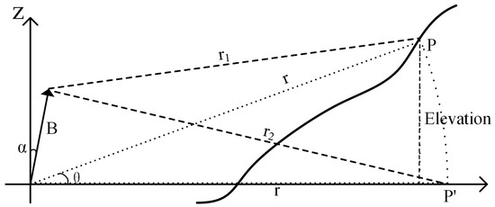 Without loss of generality, considering a target P and its corresponding point P′ on a flat plane, the elevation phase can be calculated by subtracting the phase caused by r and r1 from the phase caused by r and . The sketch map is as depicted in Figure 3. Since the slant range R is comparative to the target height h, only when the baseline angle is can represent the target’s height. Equation (1) shows that is not directly linearly dependent on height but coupled with other terms in the ground-based situation. Thus, there is no need to decompose the interferometric phase into the elevation phase,