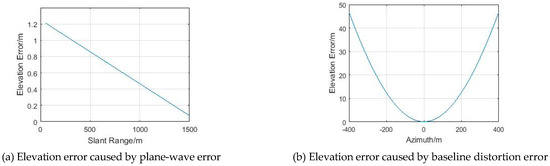 The plane-wave approximation error and baseline distortion error all originate from the geometric approximation. Specifically, the plane-wave error means that the range of the difference between master and slave images is not determined only by the baseline parallel component ; the baseline distortion error means that the baseline component, especially the baseline angle, is not a constant throughout the whole scene since the plane determined by the baseline vector and target is adaptive to the target position and not always vertical. A simulation is described in this section in order to show the forms of those errors. An ideal slope with a typical range and gradient is chosen, and the error between the ideal slope and the DEM generated by Reference [7] is acquired. The curves along the range (Figure 4a) and azimuth (Figure 4b) are extracted from the surface error. The elevation error curves are depicted as the plane-wave error along the slant range and the distortion error along the azimuth direction. It is clear from Figure 4 that those errors have a significant influence in the situations involving a short slant range area and huge azimuth angle area, which are quite common in ground-based scenarios. The former error may reach the meter level, and it decreases as the range increases; the latter error may reach the level of tens of meters, and it decreases as the azimuth decreases.