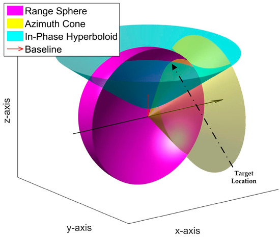 The physical meaning of the interferometric measurement can be expressed as follows. Equation in Equation (3) represents a sphere determined by the range, and equation in Equation (3) represents a cone determined by the azimuth angle. Therefore, the target point is located in a circle on the range sphere cut by the azimuth cone. When considering the beam width, the target located in an arc on that circle is cut by a beam dihedral angle. The interferometric phase constraint, , can be expressed as a phase hyperboloid, with no approximation involved. The target will be located at the point of intersection between the above-mentioned arc and this cone. The sketch map of this method is depicted in Figure 5. When the original equation set has been transformed into Equation (4) and is expressed as a constant , the first two equations in Equation (4) represent two planes. One is perpendicular to the rail direction vector, and the other is perpendicular to the baseline direction vector. The intersection between those two planes restrict the solution to a small area that faces error fluctuation. However, the other schemes allow the solution to slide along an arc approximatively, and the stability of the solution becomes much worse. That is the key reason that the interferometric technique can achieve better results compared with the traditional geolocation method, although they all suffer from quantization errors.