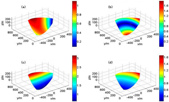 Equation (11) was applied in the simulation to analyze the error’s statistical performance. The InSAR coordinate was built as mentioned in Section 2, and the baseline stayed in the yz-plane. The DEM was a simulated part of the paraboloid since it has a different range, gradient, and orientation. The spatial information was acquired from the 3D information. Then, the correlation coefficient was calculated as in Section 3.2 in order to get the interferometric phase error, and the other error sources were set to m, mm and . The error is shown in Figure 6.