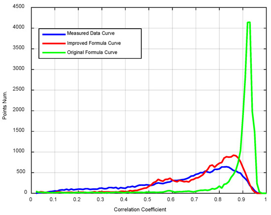 Figure 10 compares the coefficient statistical distribution calculated by different formulas using the 45 cm conditions in Figure 9. It is clear that the curve calculated by the original Equation (24) (green line) widely deviates from the real-data curve (blue line) generated by Equation (25), but the curve calculated by Equation (24) (red line) is similar to the real-data curve.
