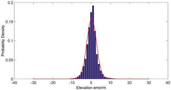 According to the results, the LiDAR DEM is set as the true value, and the GB-InSAR DEM is estimated. The DEM error is acquired by subtracting these two DEMs, and both the statistical and spatial distributions of the error can be determined. The statistical distribution of the error is shown in Figure 12. A Gaussian distribution is used to fit the real-data histogram, and the mean value and standard deviation of the fitting curve are 0.2 m and 2.9 m, respectively. These values prove the effectiveness of the DEM generation formula proposed in this paper.