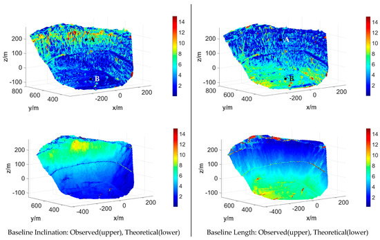 For the baseline inclination, the error is set to 0.5°. The area with a larger slant range has a larger DEM error. For the baseline length, the value in the experiment is 15 cm. In the DEM generation step, a 10 mm baseline length error is added, so the DEM is generated by the baseline parameters at 16 cm. It is clear that the bottom part is more influenced than the top stripe area. The theoretical error distribution for each situation has the same tendency compared with its main error sources shown in Figure 14. Two test sets, denoted A and B, were chosen from the front slope and the bottom slope. The average error differences between theory and reality are smaller than 1 m, showing that the precision analysis method can fit the real data better if the main error sources are from the system parameters, as shown in Table 2.