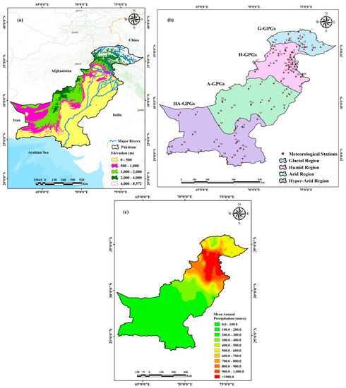 Pakistan lies between 23.5°–37.5°N latitude and 62°–75°E longitude having an area of 803,940 km2 (Figure 1a). Pakistan shares its boundaries with China at its north, India at east, Iran, and Afghanistan at west and the Arabian Sea at south. The study area is topographically very complex, with a maximum elevation of 8600 m above sea level (the Himalayas and Karakoram mountain ranges) to a minimum of 0 m (Arabian Sea).