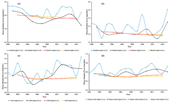 Performance evaluation of DBMA-MSPD using averaged (annual) MAE during 1-year, 2-years, 3-years, and 5-years TWW in (a) Glacial, (b) Humid, (c) Arid, and (d) Hyper-arid regions.