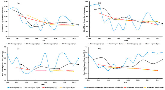 Performance evaluation of DBMA-MSPD using averaged (annual) RMSE during 1-year, 2-years, 3-years, and 5-years TWW in (a) Glacial (b) Humid (c) Arid, and (d) Hyper-arid regions.