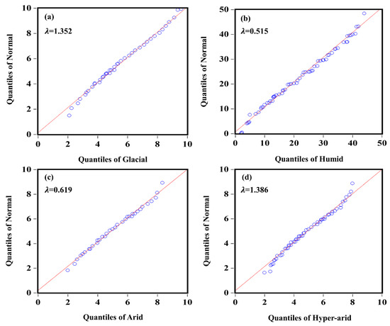 The application of Box-Cox transformation is dependent on λ values, which might be positive or negative. This demonstrates that the transformed results do not cover the entire range (−∞, +∞); therefore, approximately normal distribution of precipitation is expected. The λ is obtained by calculating a minimum of unconstrained multivariable function using the Nelder-Mead simplex technique [66]. The λ value is dependent on length of the sampling data (number of precipitation observations), and its values for TMPA, PERSIANN-CDR, Era-Interim, and CMORPH are ranging between 0.02–1.57, −0.03–2.21, 0.02–1.96, and −0.08–2.37, respectively. The λ values of TMPA at representative GPGs across each glacial, humid, arid, and hyper-arid regions are 1.352, 0.515, 0.619, and 1.386, respectively.