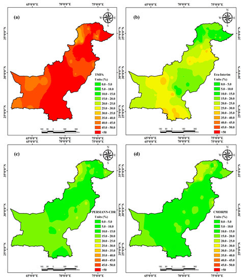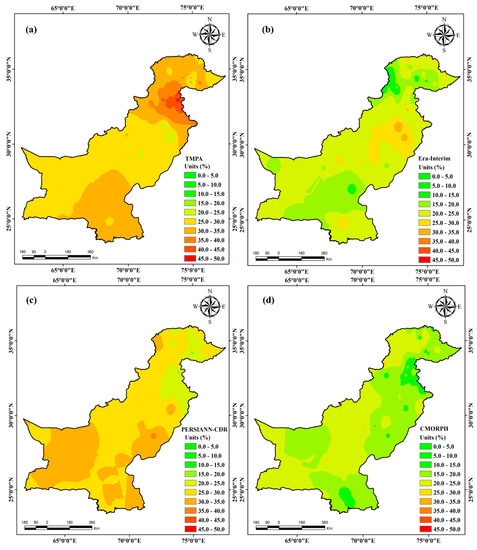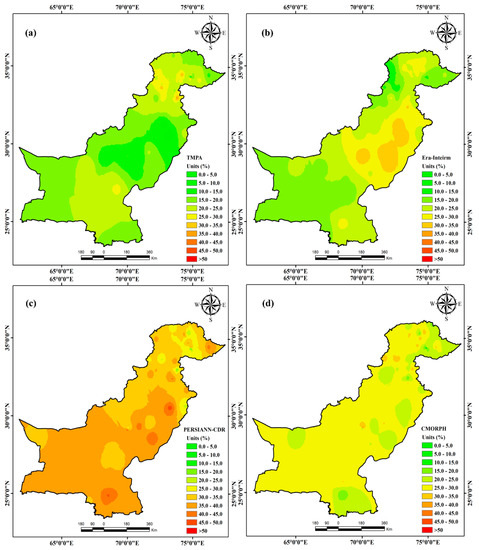 Various studies have evaluated different SPPs against the GPGs both on regional and global scales at daily [16,17,18,19,20,21,22], monthly [17,19,23,24], and annual [17,20] temporal resolutions. It is concluded from the previous studies that all the SPPs have inevitable errors based on different statistical indices, including mean error, correlation with GPGs, and other categorical indices (probability of detection, critical success index, and false alarm ratio). The errors might be associated with precipitation retrieval algorithms or other factors such as the topographic, climatic and seasonal dependency of SPPs. These errors impact the quality of precipitation estimates, which propagate further into hydrological modeling and other applications [16].