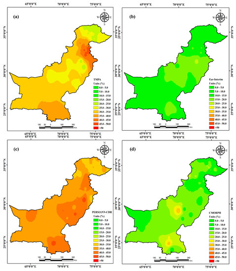 Figure 12c shows RMSE distribution, where a similar spatial distribution trend as MAE is observed, i.e., RMSE is decreasing from north to south. RMSE is ranging from 11.96 mm/day (at HMS11) to 1.72 mm/day (HAMS8). The figure depicts higher RMSE in the downstream part of the glacial region and upstream part of the humid region. Minimum RMSE is observed in the South-West of Pakistan.