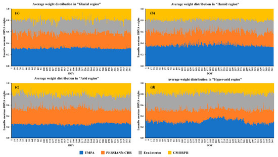 Distribution of DBMA-MSPD weights against the DOY at representative GPGs in (a) Glacial, (b) Humid, (c) Arid, and (d) Hyper-arid regions.