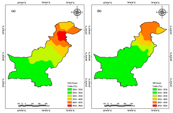 Spatial distribution of (a) ESS and (b) SD skill scores of DBMA-MSPD compared with SMA-MSPD.