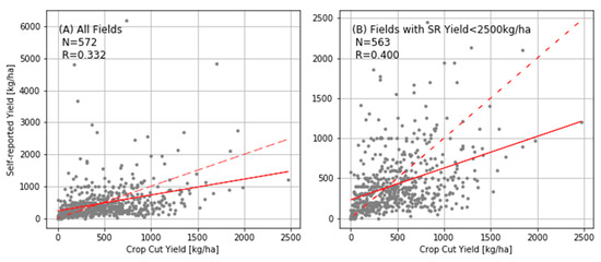 Comparison of crop cut vs. self-reported yields for (A) all fields, (B) removing SR yields above 2500 kg/ha. Best-fit regression line is shown in solid red, 1:1 line shown in dashed red. In general, the two yield measures show low agreement (R2 < 0.2) even when removing apparent outliers in self-reported yields.