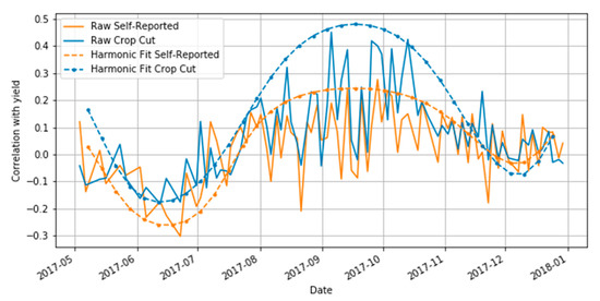 Moving to the comparison with satellite measures, Figure 4 shows the correlation between the two ground-based yield measures and GCVI for each date of Sentinel-2 imagery, both for the raw GCVI values and the harmonic fit at those dates. We find the highest correlations between GCVI and ground-based yields were observed in mid- to late-September for both self-report and crop cut yields, which is generally the same time that the GCVI curve reaches its maximum (Figure 2). The GCVI correlations with crop cut yields were consistently higher than those with self-report yields, with a peak value of 0.48 for crop cut compared to 0.23 for self-reports (Figure 4). The self-report correlation improved slightly to 0.27 when removing fields with self-report yields above 2500 kg/ha, but still remained well below the corresponding correlation for crop cuts. This finding suggests that the self-report yields are the less reliable of the two ground measures.