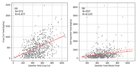 Comparison of satellite-based yield estimates to the ground-data used to calibrate the model. (A) crop cut yields and (B) self-reported yields. Best-fit regression line is shown in solid red, 1:1 line shown in dashed red. Both satellite-based models used peak GCVI from the 10th harmonic regression, as illustrated in Figure 2. In general, GCVI was more strongly correlated with crop cut than with self-reported yields.