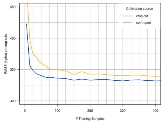 The average root mean squared error (RMSE) between crop cut yields and satellite-based yield estimates for fields not used in calibration (i.e., out-of-sample), plotted for different size of training datasets used in calibration and for different sources of yield data for calibration (crop cut or farmer self-report). Values shown are the mean across 200 different random subset of calibration points for each calibration size. Performance improves rapidly with each additional sample until ~30 training points, after which improvement is more gradual.