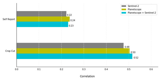 A final consideration for this study was whether the spatial resolution of the satellite data is a major factor determining the performance of satellite-based models. The Planetscope imagery was processed in the same manner as Sentinel-2, with recursive harmonics fit to the GCVI observations, and the peak of the harmonic fit used to predict yield. We also considered whether combining Sentinel-2 and Planetscope observations, which results in a denser time series of VI observations, led to any improvements. Overall, the two sensors performed similarly (Figure 7), suggesting that the benefits of a finer resolution (for Planetscope) or better sensor spectral resolution and signal-to-noise (for Sentinel-2) were not substantial in this particular system.