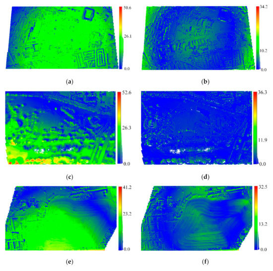 Cloud-to-cloud (C2C) distance (m) maps achieved by coarse registration for (a) building area, (c) river ecosystem, and (e) soil area and fine registration for (b) building area, (d) river ecosystem, and (f) soil area.