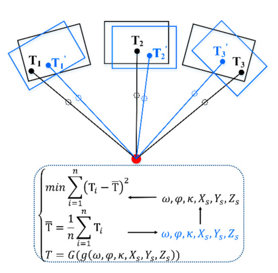 Strategy 3: Both of the above strategies assume that a precise registration is given and no further image pose refinement is considered in the thermal attribute mapping procedure; however, small misalignments in overlapping images are hard to remove. Thus, another possible approach is to further refine the exterior orientation parameters of the candidate thermal images with respect to the targeted RGB point clouds. As shown in Figure 6, the core idea is to perform a global image pose refinement by minimizing the temperature disagreements calculated from overlapping thermal images for the same object points [23].