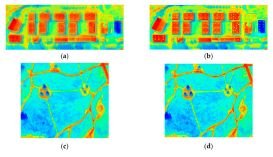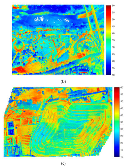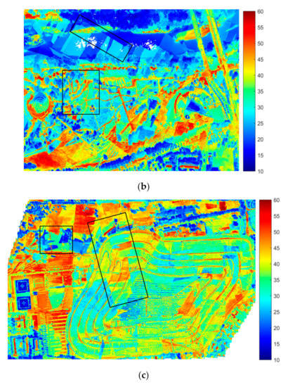 In general, the examples of the thermal attribute mapping results showed the potential of the oblique airborne thermal–RGB cameras system. In this study, point cloud registration rather than image matching was utilized for registration between thermal imagery and RGB point clouds. In fact, when RGB cameras and thermal cameras have fixed relative poses and are synchronized, the corresponding thermal–RGB image pairs can also be precisely registered using multimodal image matching (e.g., radiation-invariant feature transform, RIFT in [23]), taking fixed transformation as initialization. An advantage of our method is that it avoids matching hundreds of image pairs, which is not computationally efficient. The developed techniques are not limited to the specific 4 + 4 camera system used in this study, but can be employed arbitrarily with other RGB–thermal camera configurations.