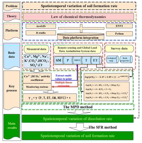 The objective is to solve the spatialization problem of SFR. On the basis of the law of chemical thermodynamics and through various platforms, such as ArcGIS, ENVI, R studio, and Python, we must calculate the various parameters required for the dissolution rate. These parameters included Ca2+ activity coefficient () and HCO3− activity coefficient (), limestone solubility product constant (Ks), equilibrium constant of CO2 dissolved in water (K0), first-order ionization constant of H2CO3 (K1), second-order ionization constant of H2CO3 (K2), and carbon dioxide partial pressure (pCO2). (1) In order to simulate the spatial distribution of activity coefficients of Ca2+ and HCO3− ions, firstly, the Ca2+ and HCO3− activity coefficients of 43 stations were calculated by using the hydrochemical data of 43 river basins. Then the corresponding values of P, ET, T, NDVI and SM were extracted from the geographical coordinates of 43 stations. The activity coefficients of Ca2+ and HCO3− ions were used as dependent variables, and the extracted P, ET, T, NDVI and SM values were used as independent variables. Multiple linear regression (MLR) was carried out in SPSS, and the relationship between the dependent variables and independent variables was quantified. Finally, the spatial distribution of Ca2+, HCO3− ion activity coefficients is retrieved by the regression relationship and P, ET, T, NDVI and SM spatial data. (2) Ks, K0, K1, and K2 were calculated by T. (3) pCO2 was measured by ET. We calculated the dissolution rate of limestone via the MPD method. Then, we obtained the spatial distribution of five lithological dissolution rates in the karst areas of China on the basis of the dissolution ratio of other lithologies and limestones. Finally, we measured the SFR by combining the density of rocks and the content of acid-insoluble substances (Figure 3).