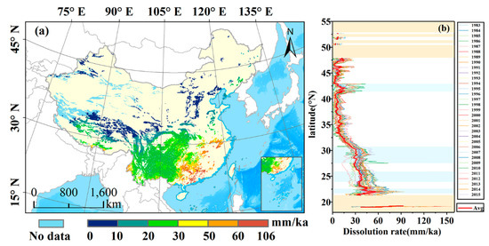 Spatial distribution (a) and latitudinal variation (b) of average annual dissolution rate of karst in China during 1983~2015.