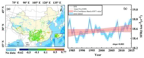 The evolutionary trend of SFR was analyzed at the pixel scale (Figure 8a). Generally, a slight increase in SFR occurred locally, whereas in most areas, it remained stable. On the basis of the area proportion of different SFRs (Figure 8a), the proportions of significant reduction, slight reduction, no change, slight increase, and significant increase were 4.54%, 0.06%, 75.03%, 19.14%, and 1.23%, respectively.