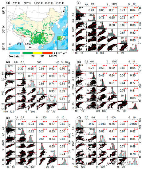 Influenced by lithology, landform, topography, and meteorological factors, SFR in the study area showed a significant regional difference. On the basis of the multiyear average SFR during 1983–2015, the SFR in the study area ranged between 10 t km−2 yr−1 and 134.93 t km−2 yr−1, averaged at 18.59 t km−2 yr−1 (Figure 7a). Spatially, the SFR was high in southeast and low in northwest. The different grades of SFR were analyzed statistically. The results showed that 86.44% of the study area had an SFR of <15 t km−2 yr−1, distributed anywhere in the study area. Furthermore, 9.06% of the study area had an SFR ranging between 15 t km−2 yr−1 and 55 t km−2 yr−1, distributed sporadically, and 4.50% had an SFR ranging between 55 t km−2 yr−1 and 134.93 t km−2 yr−1, distributed dispersively.