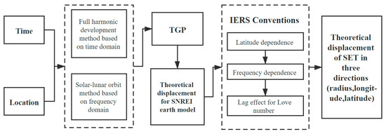 The theoretical models of the SET, which are extensively used at present, take into account the influence of many complex factors, such as the earth’s ellipticity, rotation, inelasticity of the mantle, non-hydrostatic equilibrium, and lateral inhomogeneity. In this study, we refer to the principle of the DDW99 tidal model and the precise tidal correction parameters for the ground point displacement provided in the IERS Conventions [31,32]. The point displacement accuracy of the model can reach millimeter level [33]. The main process of the algorithm for the tidal displacement is demonstrated in Figure 1.