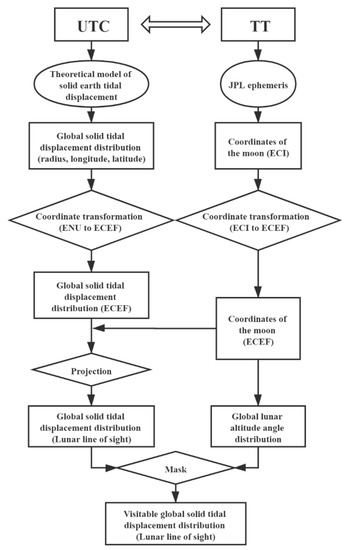 Flowchart of displacement distribution from lunar view. The time input into the tidal model and Jet Propulsion Laboratory (JPL) ephemeris are coordinated universal time (UTC) and terrestrial time (TT), respectively. The three components of the solid earth tides (SET) displacement point to the same direction as the local Cartesian coordinates coordinate system (ENU). Then, the displacement information and position information of the moon are unified into the earth-centered, earth-fixed coordinate system (ECEF). After the displacement projection, the displacement distribution of the SET is masked by the observable range obtained from the lunar altitude angle.