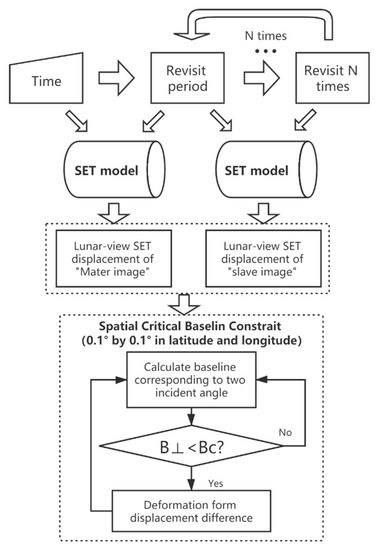 Flowchart of the calculation of the spatiotemporal baseline and SET deformation in the effective interference region. The scanning trajectory of lunar synthetic aperture radar (SAR) is approximately parallel to the equator, as shown in Figure 6. The relationship between the longitude of lunar subpoint and accurate time point is established according to the ephemeris data. After inputting a start time of the master image, the revisit period can be determined. Additionally, the accurate time points of various longitudes as well as the start time of next scan can be calculated (assuming that the earth rotates at a constant speed). In this way, the displacement matrices under multiple revisits can be obtained by inputting longitude, latitude, and time point into the SET model. The vertical baseline () matrix as well as the critical baseline () matrix can be obtained via the ECEF coordinates of lunar center and the incident angle matrix (according to the lunar altitude angle matrix). The deformation matrices in effective interference regions under multiple revisits can be obtained through the displacement matrices difference and the critical baseline constraint () at every latitude and longitude.