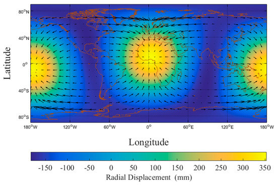 The development and application of space geodesy technology have brought new possibilities for the observation of SET. Some space technologies such as very long baseline interferometry (VLBI), global positioning system (GPS), lunar laser ranging (LLR), and satellite laser ranging (SLR), have contributed to the observation of SET. For example, GPS technology is used to correct the asymmetric atmospheric residuals in the observation of gravity solid tides [5]. However, it is still difficult to directly observe the SET displacement through GPS networks. There is a need to improve the sampling density of GPS networks. The special texture features of displacement distribution can be easily hidden in various errors. Furthermore, in any geodetic analysis, it is important to consider how the displacement of SET may affect the instantaneous site position, and it is mainly through the SET model or the assumption that the average values of the unmodeled periodic ground displacement with approximate semidiurnal and diurnal periods are close to zero. [6,7]. This means that high-precision geodesy needs the theoretical displacement of SET. It is hard to distinguish the difference between the actual displacement and the theoretical displacement of SET from other types of surface displacement without combining the special texture information.
