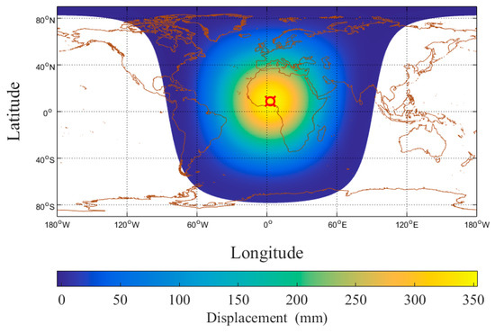 Radar interferometry can capture the deformation information along the line-of-sight. When the range of radar incident angle is not considered, the SET displacement information from lunar view can be obtained by displacement projection and lunar altitude angle mask, as shown in Figure 5.