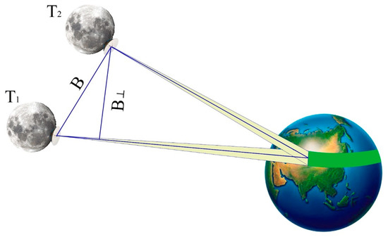 Single-station observation geometry of moon-based interferometric synthetic aperture radar (InSAR). The T1 and T2 represent two different time points.