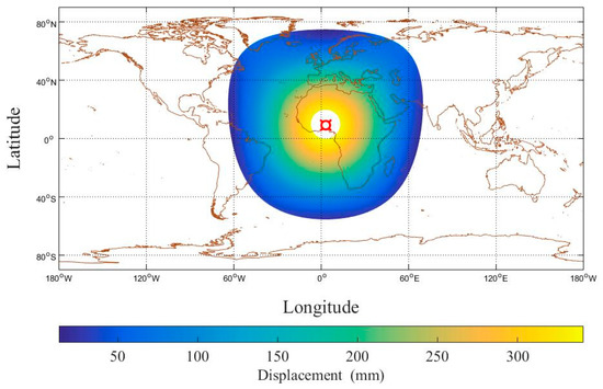 Global displacement distribution in moon direction at 0:00 on 2 March 2018. The image is obtained by masking the projected displacement distribution in the area with a negative lunar altitude angle. The non-displacement area is the absolute blind area of the lunar sensor at that time. The sum of the tidal displacements is distinguished by different colors, and the red “¤” sign indicates the lunar subpoint.