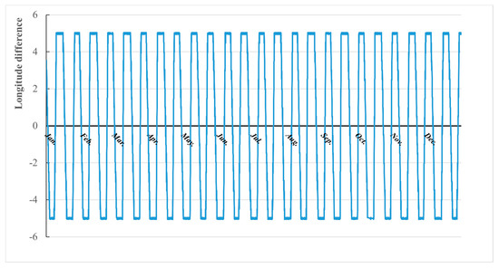 The squint angle of the lunar SAR is defined as the angle between the antenna pointing and meridian plane passing through the lunar subpoint. By controlling this angle, the radar beam can cover the area with more tidal displacement, which makes D-InSAR obtain more deformation information. The longitude difference between the extreme point of the earth’s tidal displacement and lunar subpoint was calculated, as illustrated in Figure 8, which can provide a reference for the squint angle selection.