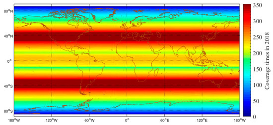 The side-looking observation will be used for further simulation work. The spatial coverage and SET information can be maximized while sacrificing the blind area close to the subpoint, and the imaging distortion caused by the earth’s curvature can be reduced. The temporal coverage with side-looking observation and incident angles of 10–66° is demonstrated in Figure 9. We can draw the following conclusions from it: (1) the temporal coverage at the same latitude is relatively uniform, and it changes significantly at the different latitude; (2) the observable region is approximately concentrated between 85° N and 85° S and the region with more than 200 revisits is approximately concentrated between 60° N and 60° S, which includes most of the terrestrial part of the earth.