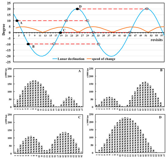 Lunar declination in February and March 2018, as well as the four cases for the change of spatial baseline. The horizontal axis represents the revisit times. The vertical axis of the upper figure represents the lunar declination. The blue line and the orange line represent the trend of declination and its own change speed, respectively. (A–D) represent the change trend of spatial baseline in different revisits when the time point of the master image was located at the lunar declination shown in the upper figure.