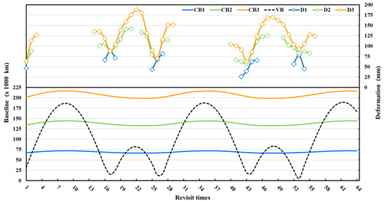 The change of the vertical baseline also has its own periodicity, and the length of the change period is approximately 26 or 27 revisits, as indicated by VB. The chart contains two change periods. In each change period, the deformation information of approximately 17th and 26th revisit periods hardly changes with the increase of the signal bandwidth. This is because the vertical baseline between these two revisits is relatively small and the effective observation region can reach the maximum in each EIC. In this case, the corresponding deformation span is approximately 8.8 and 7.0 cm, and after considering the swath width it will be reduced to 4 cm.