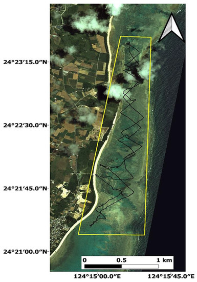 The study site is located in the Shiraho subtropical region, which is included partly in the southeastern part of Ishigaki Island, Japan (see Figure 1). This is an area rich in marine biodiversity, with shallow, low-turbidity water [47] and a maximum depth of 3.5 m. The Shiraho area has various reefscapes, including complex patches of branching (Acropora) and massive corals (Porites). Moreover, it has a large colony of a Blue Ridge coral (Heliopora coerulea). There are also a wide range of brown algae and blue algae, a variety of geomorphic features (soft sand, cobble, and boulders), and seagrass.