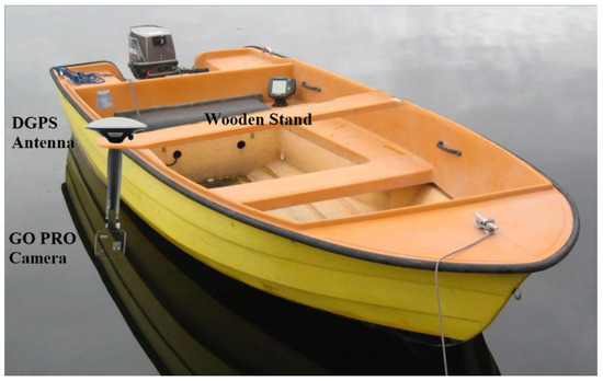 Benthic cover field data collection began on 21 August 2016 (see Figure 1). Underwater videos were obtained using a low-cost compact high-resolution camcorder (GoPro HERO3 Black Edition, 1440 video resolution, 30 frames per second with a wide field of view). The utilized GoPro HERO3 camera has stable interior orientation parameters (IOPs) [48]. The camcorder was attached beneath the surveying motorboat side just under the surface of the water to observe the shallow seabed. A series of four hours of video recordings from the survey trip were acquired. These recordings were geolocated using a differential global positioning system (DGPS) system mounted vertically by a wooden stand above the camera. Figure 2 is an illustrative picture to describe the DGPS and the camera positions on the motorboat. A free video to image converter software package was used to extract images from the video files with a one-second image interval and a minimum 60% overlap to be synchronized with the DGPS surveys. The DGPS kinematic observations were post processed using the online Natural Resources Canada Precise Point Positioning (PPP) service (https://webapp.geod.nrcan.gc.ca/geod/tools-outils/ppp.php), thereby achieving centimeter-level accuracy. To properly locate the camera center points, 55 cm was subtracted in the Z direction, which was the distance between the receiver antenna and the camera position. The resulting positions were used as the camera positions in the 3D model production input process. From the extracted images, 3000 images with known locations (using the DGPS system) were labeled manually for seven classes (see Figure 3).