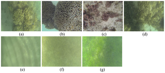 Various examples of still seafloor images obtained with a GoPro Hero 3 towed video camera for each habitat class over the Shiraho study area: (a) corals, (b) blue corals, (c) brown algae, (d) algae, (e) soft sand, (f) hard sediments, and (g) seagrass.