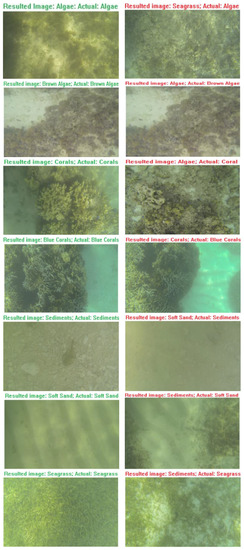 Rigby et al. [14] used 55 images captured by a towed camera to extract eight classes using the Bagging of Features (BOF) approach with a Gaussian classifier. These eight classes were algae, corals, sponges, rhodoliths, uncolonized classes, and mixed classes. However, because of the nonuniform and poor lighting and the overlapping of species, there were significant similarities between their features, and the proposed approach failed to completely discriminate between some classes. Accordingly, this approach requires further development.
