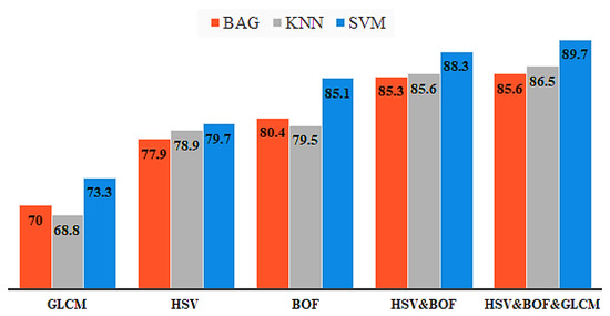 - The extracted attributes produced from the BOF, HSV, and GLCM approaches were used as the inputs for training three machine learning soft classifiers (BAG, SVM, and k-NN), and the image labels were used as the outputs.
