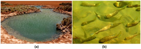 Sebkhas are wet depressions in desert environments that are generally regarded as floodplains of significant environmental interest and have been closely linked to many environmental issues, such as climate change, water quality, wildlife habitat, and biodiversity. Recent studies by the Scientific Institute of Rabat and the Nature Initiative Association of Dakhla have focused on Imlili Sebkha in southern Morocco, whose geomorphological structures have retained the impacts of previous climate conditions in the Sahara [1,2,3,4,5,6]. Sebkhas are supratidal sandflats that are formed along arid coastlines. These landforms have evaporate–carbonate deposits with siliciclastics and form subaerial, prograding, and shoaling-upward sequences with an average thickness of 1 m or less [7]. Previous studies have shown that the palaeoclimatic regimes over Saharan Morocco have alternated between dry and wet periods throughout the Pleistocene [8] and that the reserves of Saharan fossil aquifers are filled during humid periods [9]. The water supply of these pockets is not random and is guaranteed by the small resurgences that appear at the lower part of the area, thereby preserving the moisture on the groundwater surface of the sebkha’s soil, especially at the western and northern edges of the area [10]. While the median part of this sebkha holds over tens (161) of pockets of permanent water with diameters ranging from 1 m to 10 m, these pockets have a depth of approximately 4.6 decimetres and a water salinity of 24 g/L to 350 g/L (Figure 1a). However, these water pockets host many animals and fish (Figure 1b) as reported during a scientific field trip in April 2017. In fact, neither the general landscape nor the climatic data of the region suggest the existence of permanent salt water cavities that are capable of housing fish. Although its high salinity has caused birds to flee, Imlili Sebkha has created a favorable habitat for a Cichlid fish species associated with Tilapia guineensis, a species previously unknown in Morocco and whose northern limit was previously limited to the Senegal River.